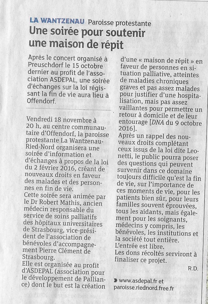 DNA du mardi 15 novembre 2016Par Asdepal / décembre 21, 2019 Lien vers l’article Une soirée pour soutenir une maison de répit