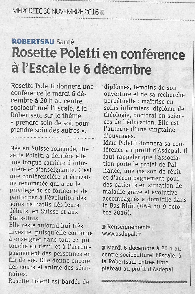 DNA du mercredi 30 novembre 2016Par Asdepal / décembre 21, 2019 Lien vers l’article Rosette Poletti en conférence à l’Escale le 6 décembre